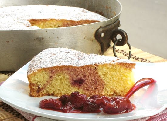 Montiamo i tuorli con lo zucchero e la scorza del limone finchè a ottenere un composto cremoso. Uniamo il burro fuso e e il succo del limone e mescoliamo. Aggiungete la farina, la maizena, ed il lievito setacciati e il latte se l’impasto dovesse risultare troppo duro. Montiamo a neve ferma gli albumi ed uniamoli al composto mescolando delicatamente dal basso verso l’alto. Trasferiamo1/3 del composto in una terrina ed aggiungiamo lo sciroppo di amarena (nel mio caso la marmellata e l’alchermes) e mescoliamo bene. Versiamo nello stampo il composto giallo e sopra quello rosa (io ho messo a cucchiaiate). Disegnamo dei cerchi con un coltello se vogliamo avere l’effetto screziato. Inforniamo a 180° per 45′ minuti circa. Sformiamo e lasciamo raffreddare sulla gratella. Cospargiamo con lo zucchero a velo e serviamo.